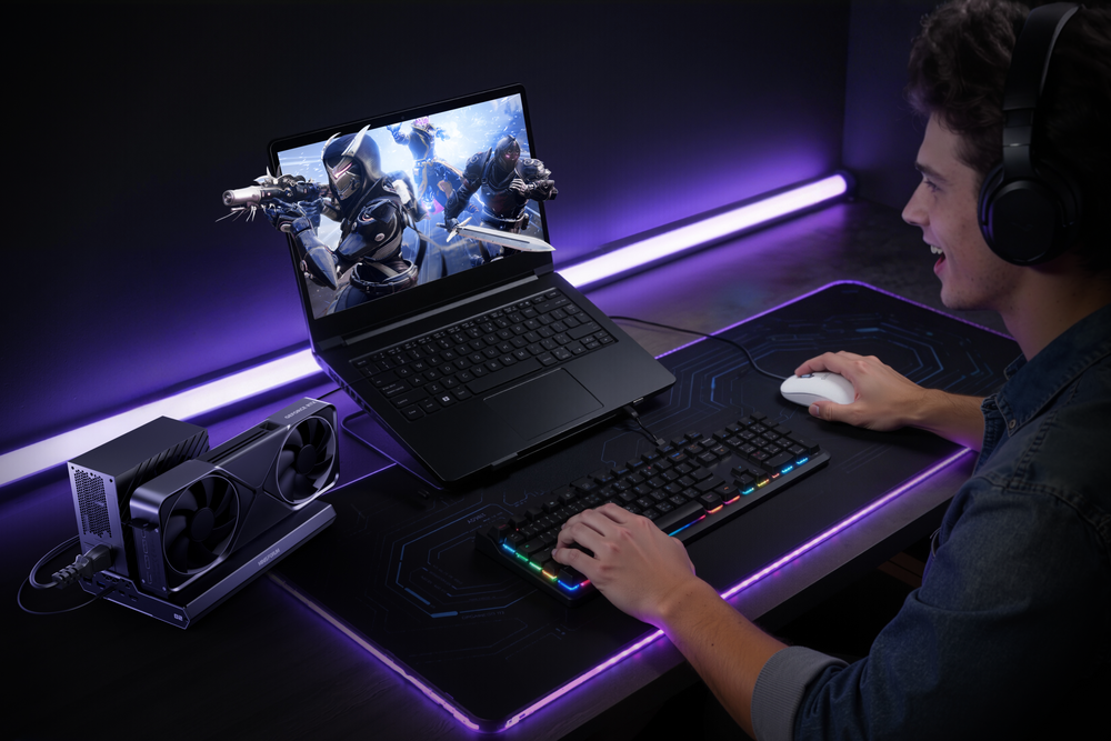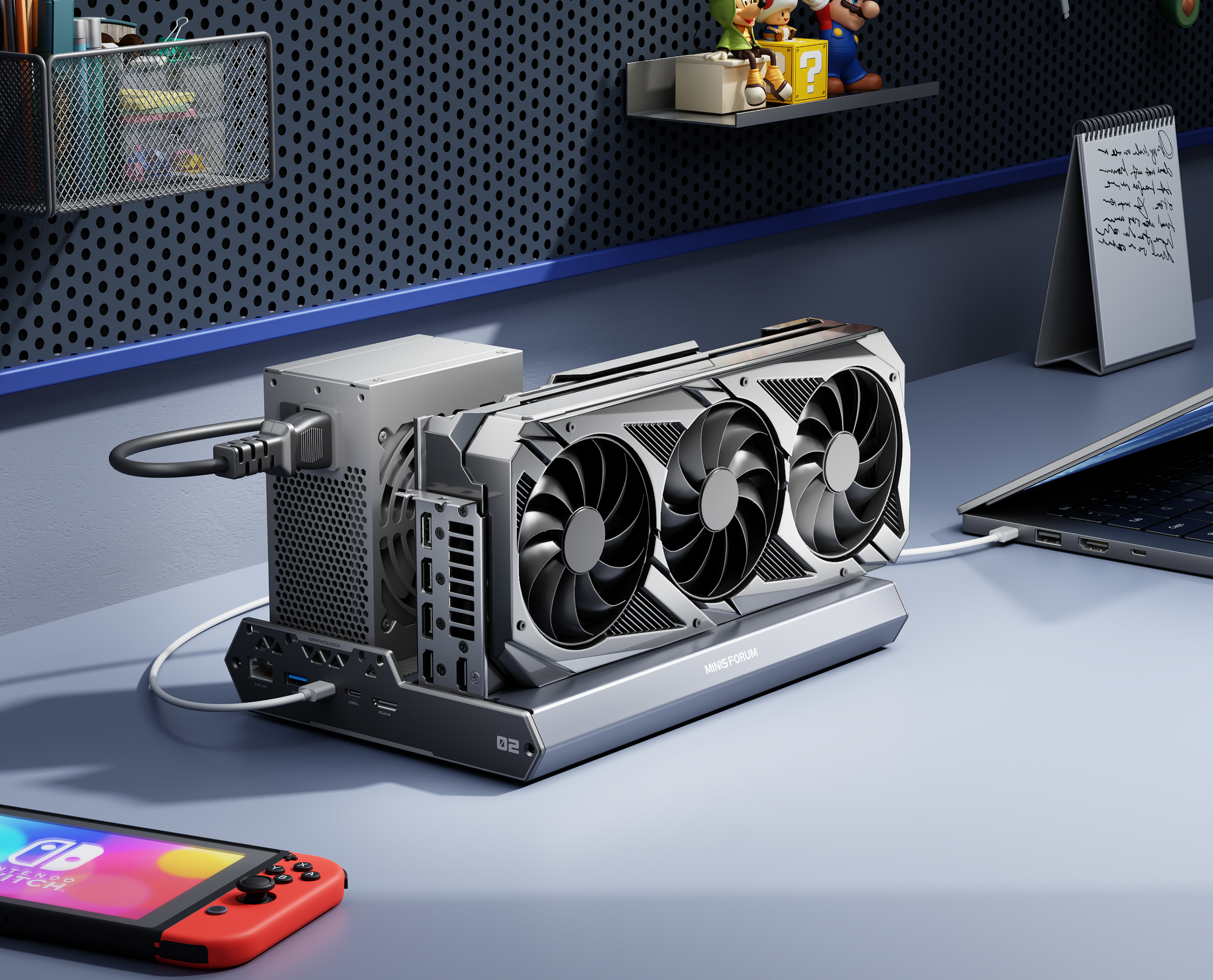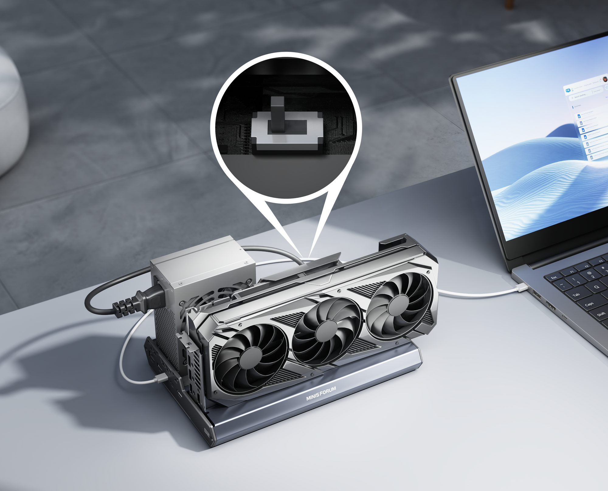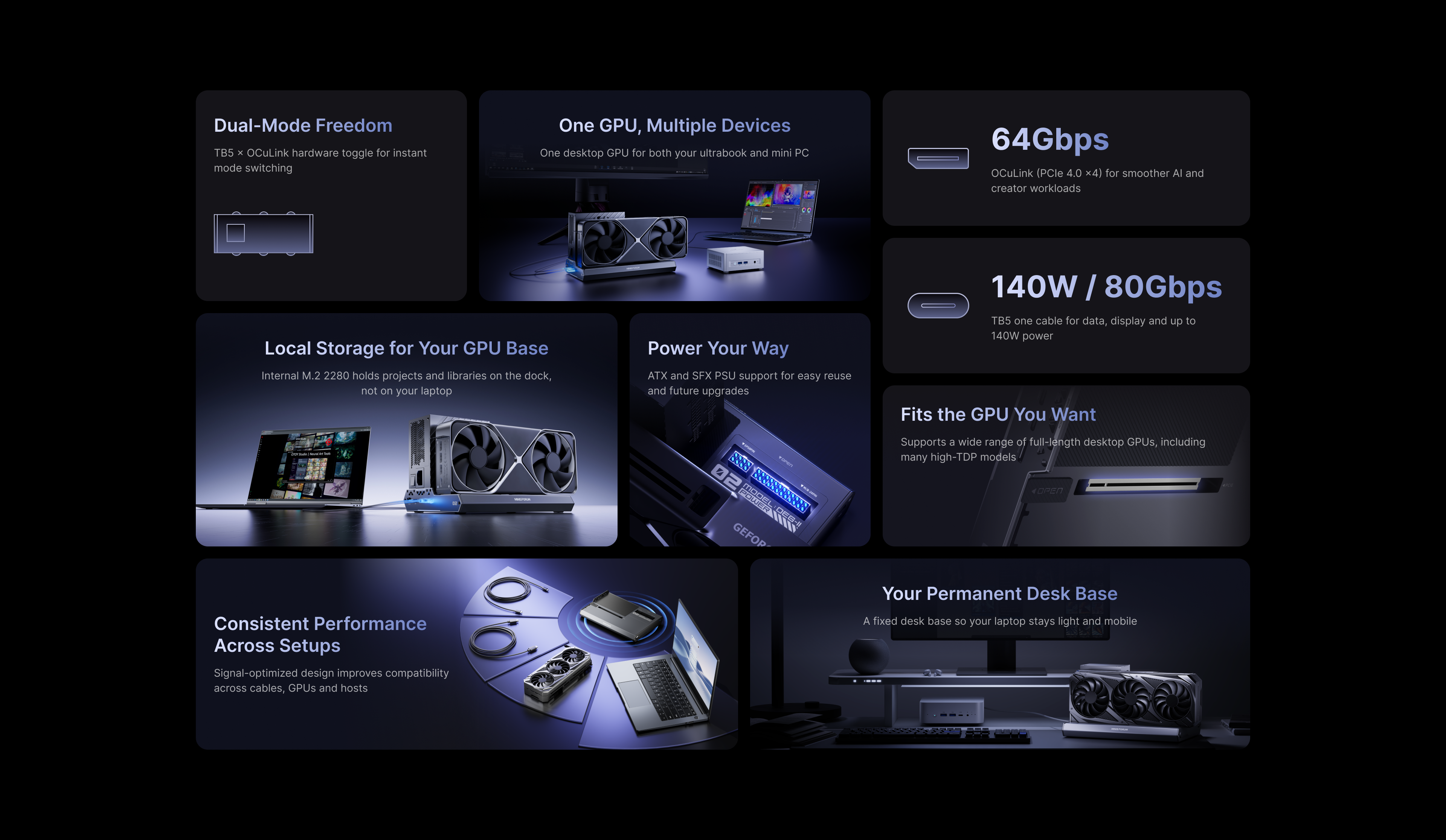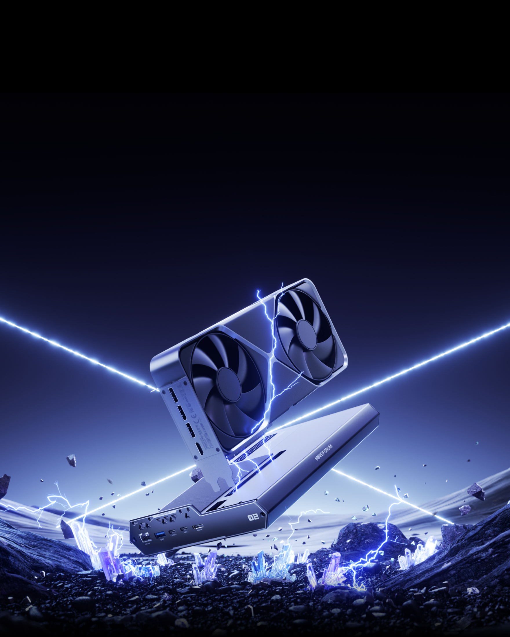 DEG2 powers on automatically with your host, so there's no extra switch to press and the experience feels like a desktop tower. With Thunderbolt 5 reverse power and full dock expansion over the same