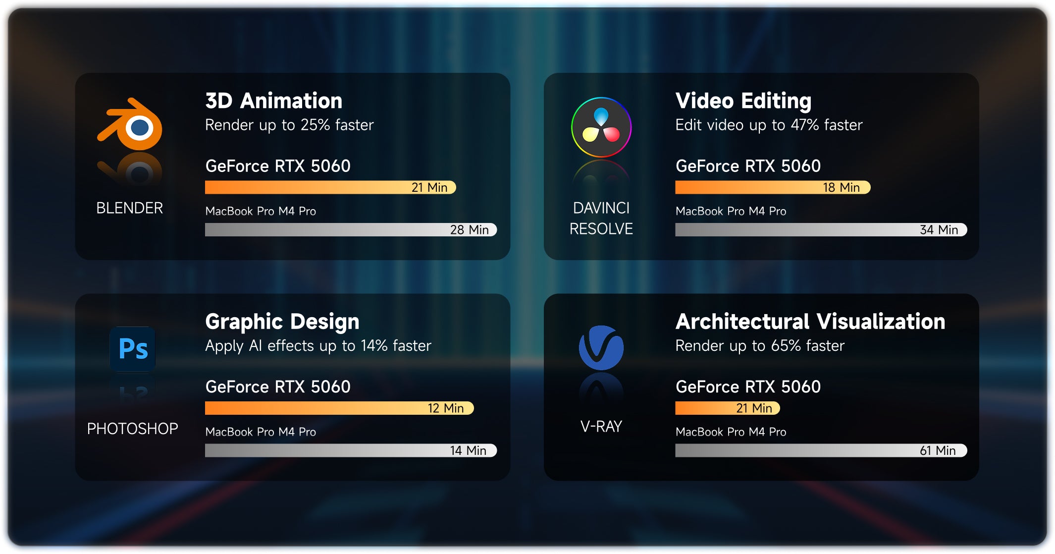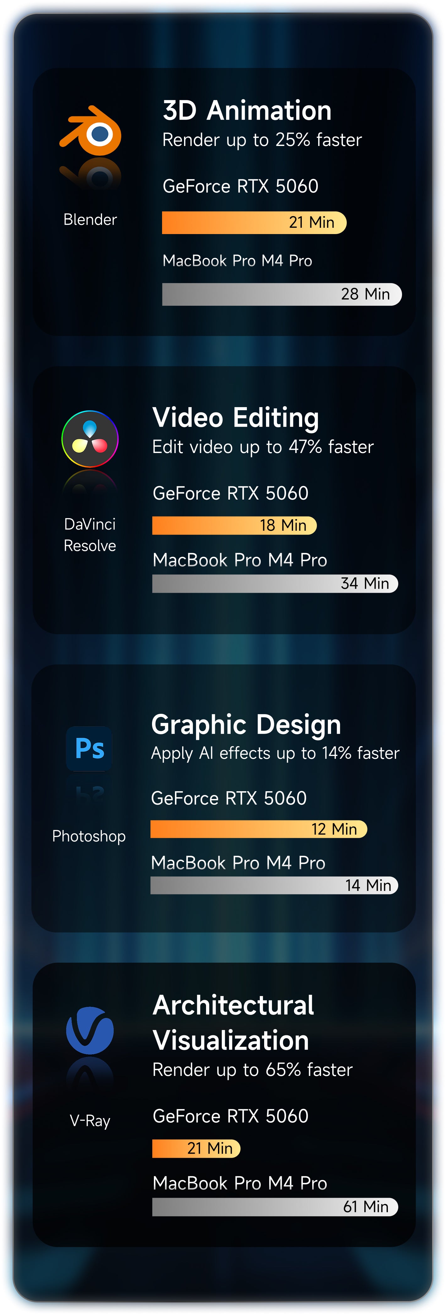 The RTX 5060 provides hardware acceleration for over 130 (and counting) creative applications across Photography & Graphic Design, Video Editing, 3D & Rendering, Broadcasting, Generative AI, and Architectural Visualization
