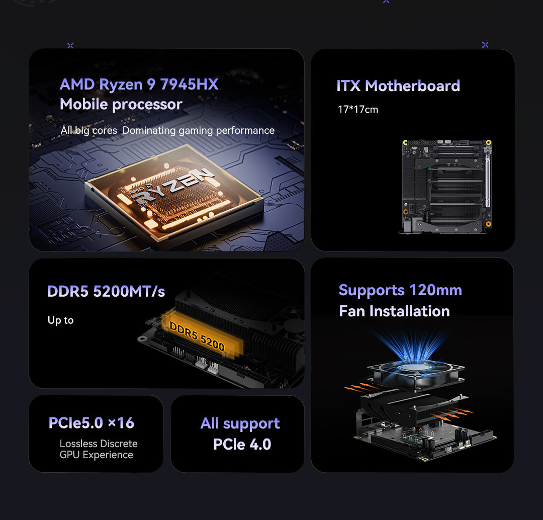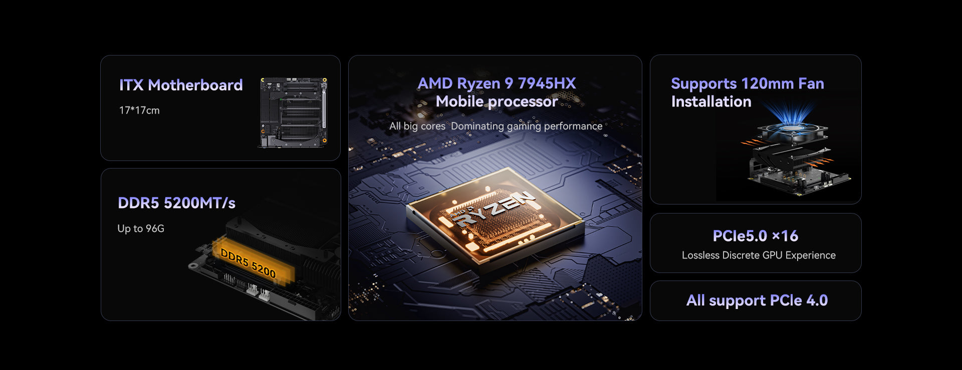 The mini-ITX M/B is the MODT (Mobile on Desktop) board powered by built-in AMD Ryzen 9 7945HX CPU with