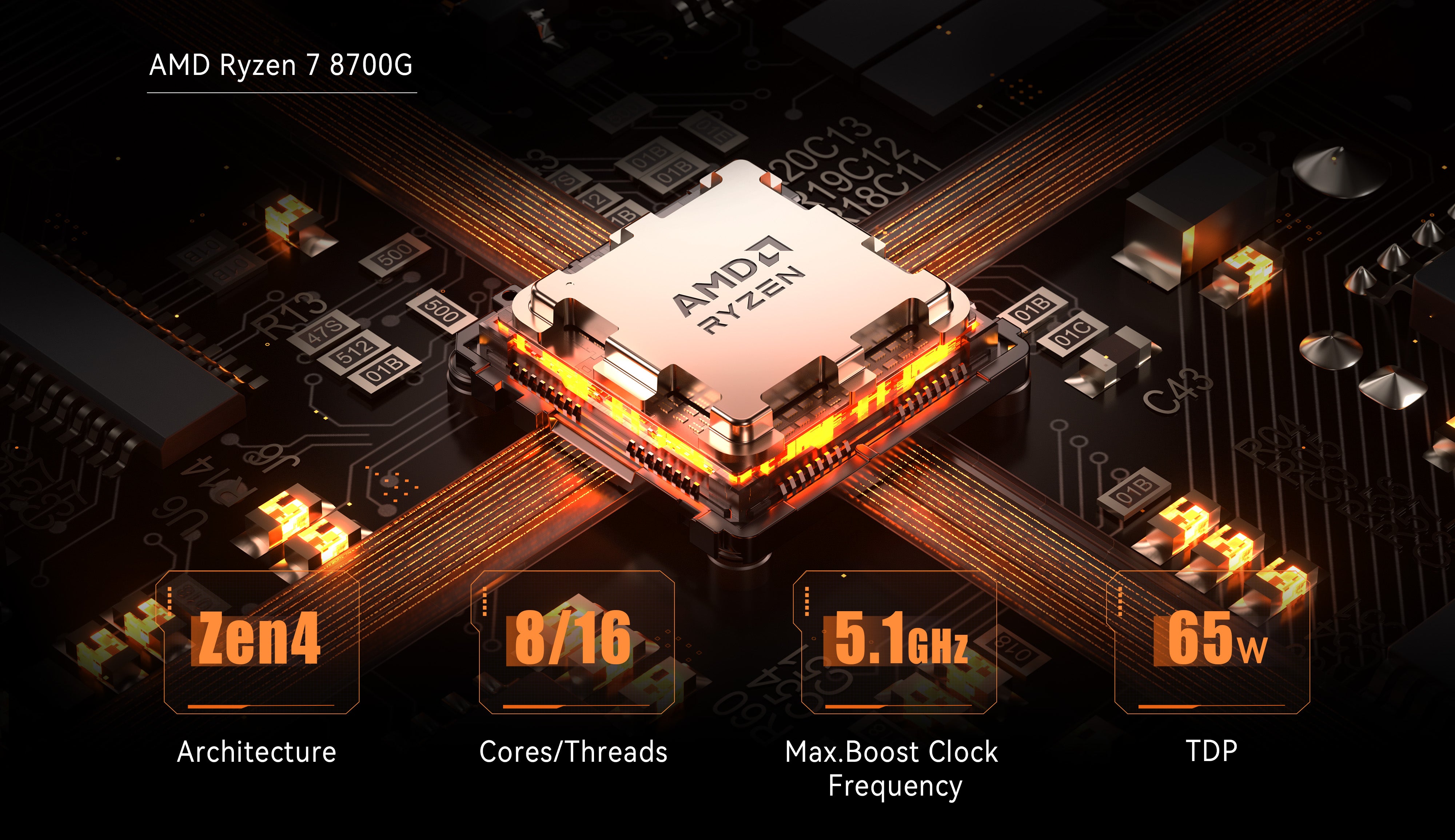 MS-A1 is based on Zen4 architecture, featuring 8 cores and 16 threads, the max. boost clock frequency of 5.1GHz, and a